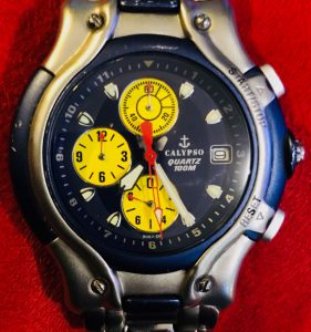 Relógio“Calipso” desenhado em homenagem ao grande investigador Jacques-Yves Cousteau (11Junho1910-25 Junho1997). Francês,Oficial da Marinha Documentalista Cineasta Oceanógrafo,inventor mundial conhecido por suas viagens a bordo do “Calipso”Inventor do equipamento de mergulho autónomo ,participou com piloto de testes de aparelhos se ultra-sons para levantamento geológico do relevo submarino.Este relógio foi oferecido á Fundação Troufa Real pelo Comandante Eduardo Correia a 21 Agosto 2018 em Luanda. Pertenceu a Philips Couteau filho de Jacques Cousteau que morreu num desastre no seu Hidroavião no Rio Tejo em Alhandra a 28 Junho 1979.