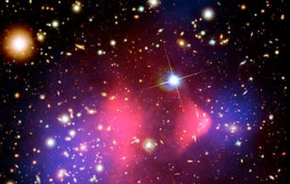 This image of the Bullet Cluster (officially known as 1E 0657-56) provided the first direct proof of dark matter, the mysterious unseen substance that makes up the vast majority of matter in the Universe. X-rays from Chandra (pink) show where the hot gas in two merging galaxy clusters has been wrenched away from dark matter, seen through a process known as “gravitational lensing” in data from Hubble (blue) and ground-based telescopes. In converting this into sound, the data pan left to right, and each layer of data was limited to a specific frequency range. Data showing dark matter are represented by the lowest frequencies, while X-rays are assigned to the highest frequencies. The galaxies in the image revealed by Hubble data, many of which are in the cluster, are in mid-range frequencies. Then, within each layer, the pitch is set to increase from the bottom of the image to the top so that objects towards the top produce higher tones.